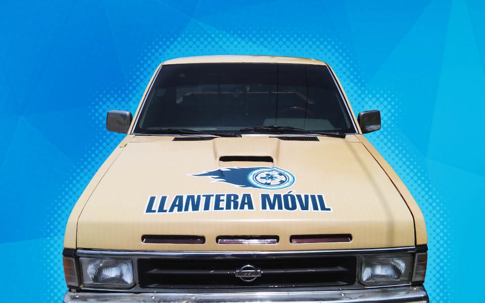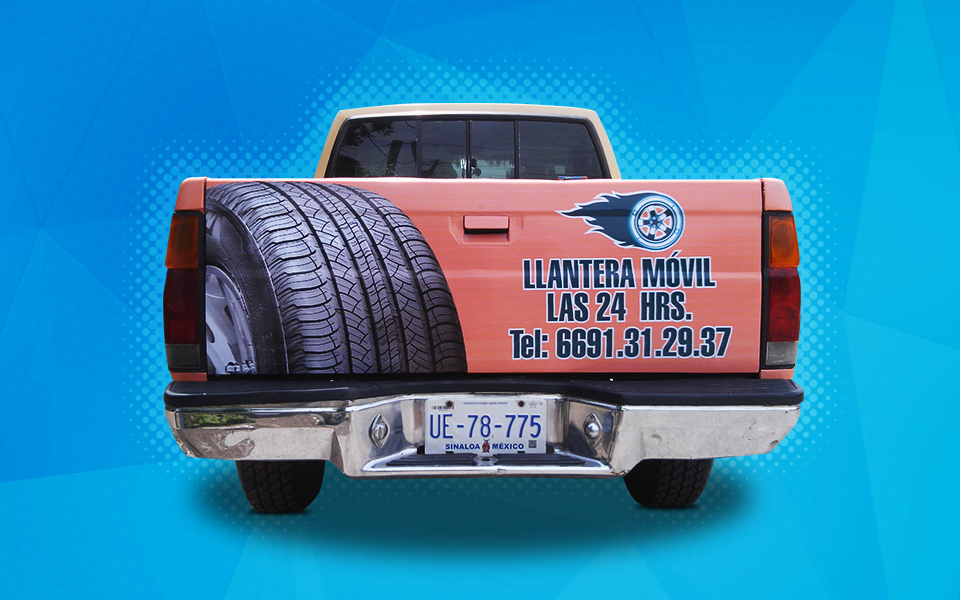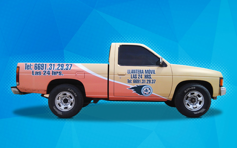 Diseño, impreción y rotulación de vehículo Nissan, llantera móvil.
